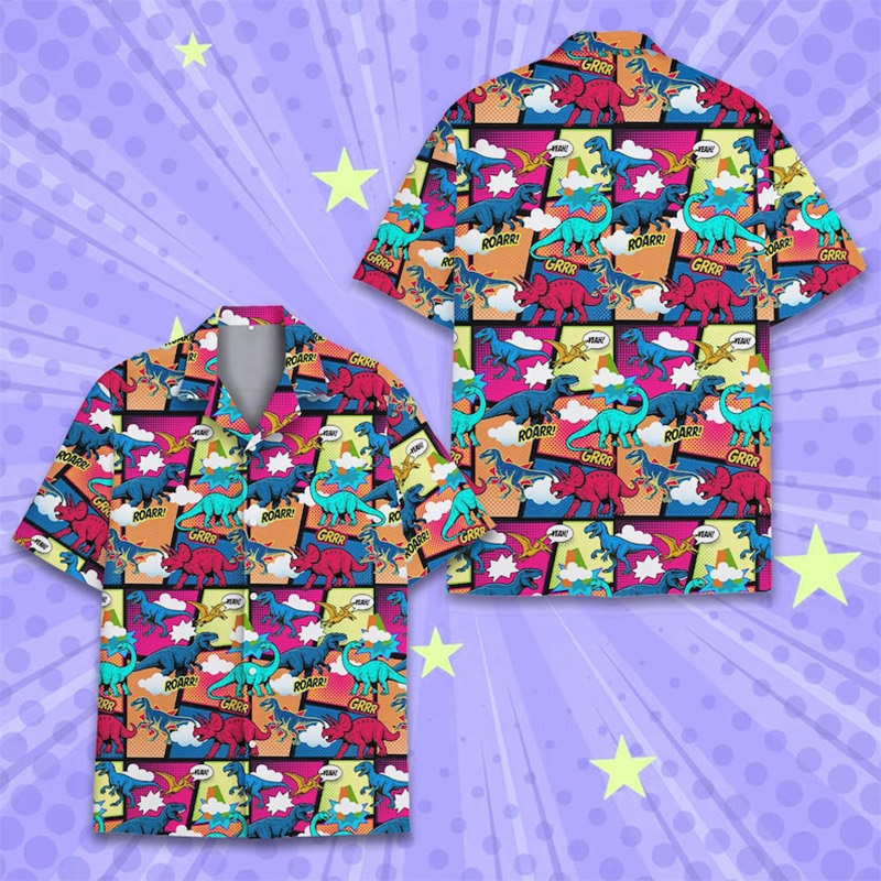 Make Every Day Feel Like a Vacation with Our Bold, USA-Printed Colorful Dinosaur Prehistoric Aloha Shirt
