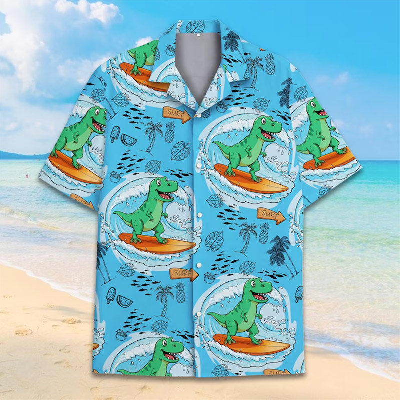 Make Every Day Feel Like a Vacation with Our Bold, USA-Printed Tropical Dinosaur Surfing Summer Beach Holiday Hawaiian Shirt