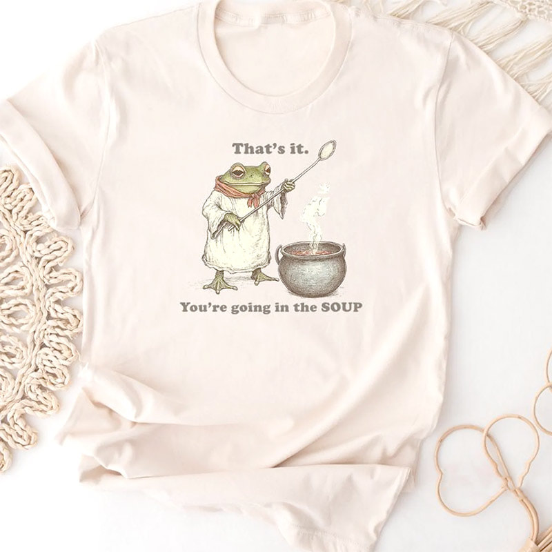 Explore our Frog Soup Meme, That’s It You’re Going In The Soup Shirt designs that are making waves right now. From vintage-inspired graphics to edgy, statement-making quotes, these shirts are not just fashionable — they’re conversation starters. Check out our latest releases and find the perfect shirt that reflects your unique personality and sense of style.