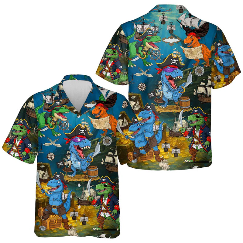 Make Every Day Feel Like a Vacation with Our Bold, USA-Printed Funny Pirate Dinosaur, Adventure T-Rex Hawaiian Shirt