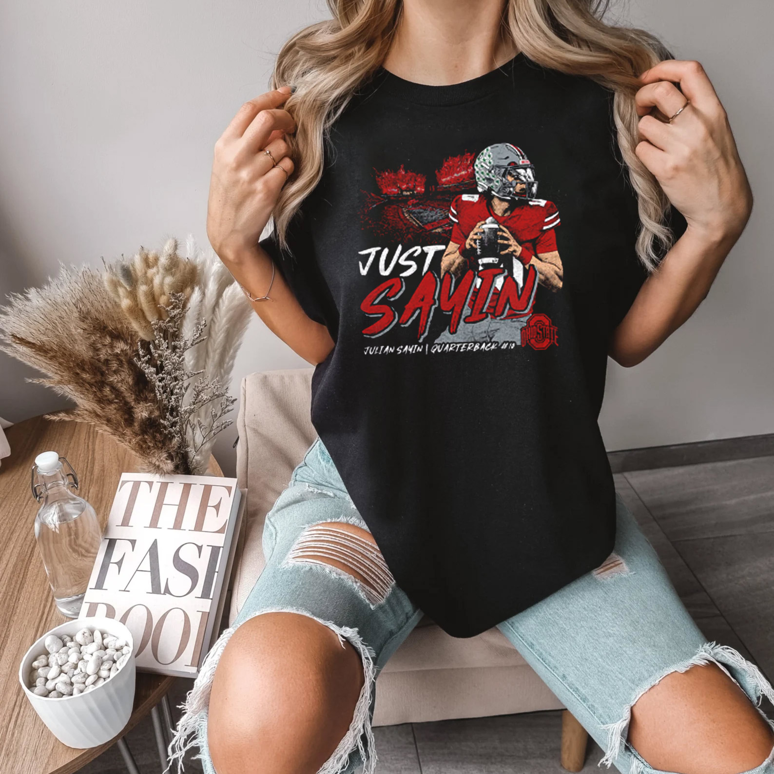 Show your Buckeye pride with our Julian Sayin ‘Just Sayin’ Ohio State Tee, perfect for true Ohio State fans. Crafted from soft, breathable cotton, this comfortable tee is ideal for game days, tailgates, or casual everyday wear. Featuring bold “Just Saying” graphics with Ohio State football spirit, the Just Saying Ohio State Football Shirt lets you cheer on the Buckeyes in style.