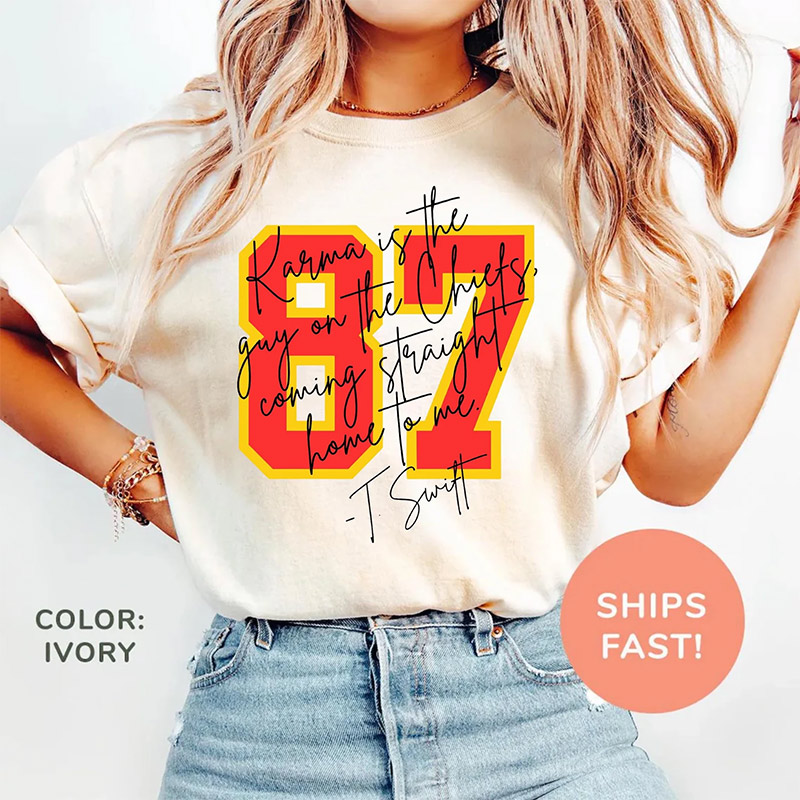 Music has the power to bring people together, and what better way to express your love for music than through a custom-designed t-shirt? Whether you’re a fan of classic rock, pop, hip-hop, or indie music, our Karma Is The Guy On The Chiefs Taylor Travis Comfort Colors T-shirt is the perfect way to showcase your passion.