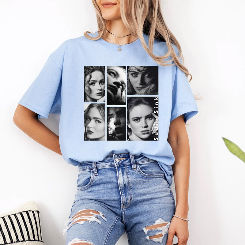 Perfect for movie nights, comic cons, or casual days out, our Sadie Sink Black And White Pictures Shirt For Fans let you celebrate your favorite films in comfort and style. Each design is a tribute to the scenes, stars, and scripts that have shaped pop culture.