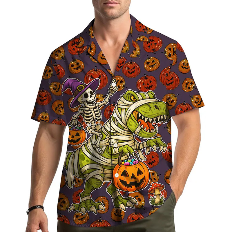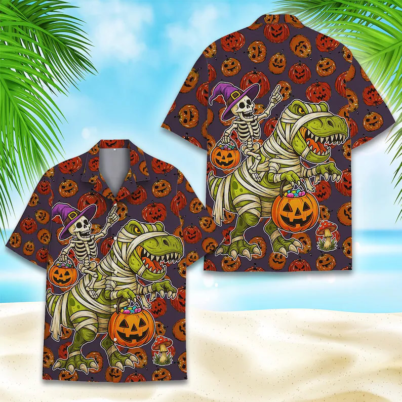 Make Every Day Feel Like a Vacation with Our Bold, USA-Printed Spooky T-Rex Halloween Party Hawaiian Shirt